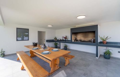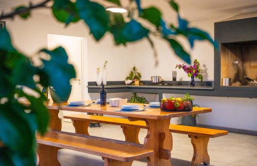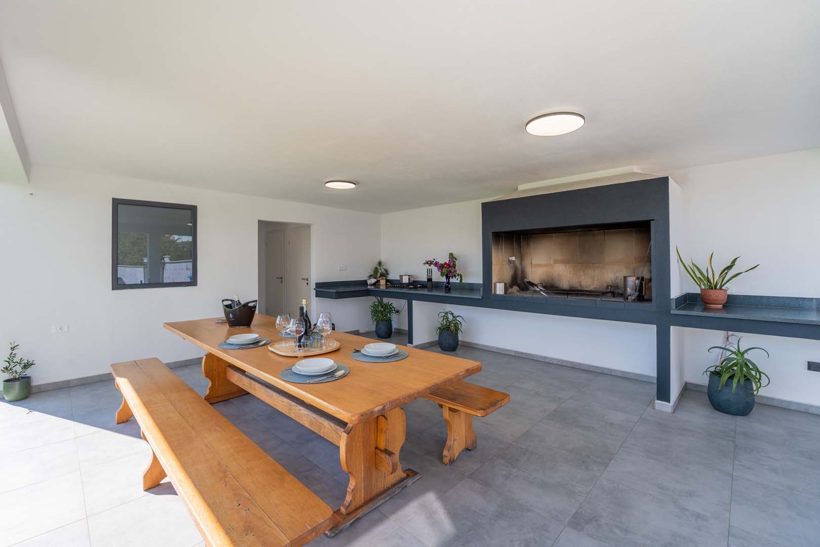 The large lawn invites you to walk barefoot and reconnect with nature, while the pool shimmers in the sunlight, inviting you to simply let go. A covered terrace with dining area and barbecue is the perfect spot for cozy evenings under the stars.